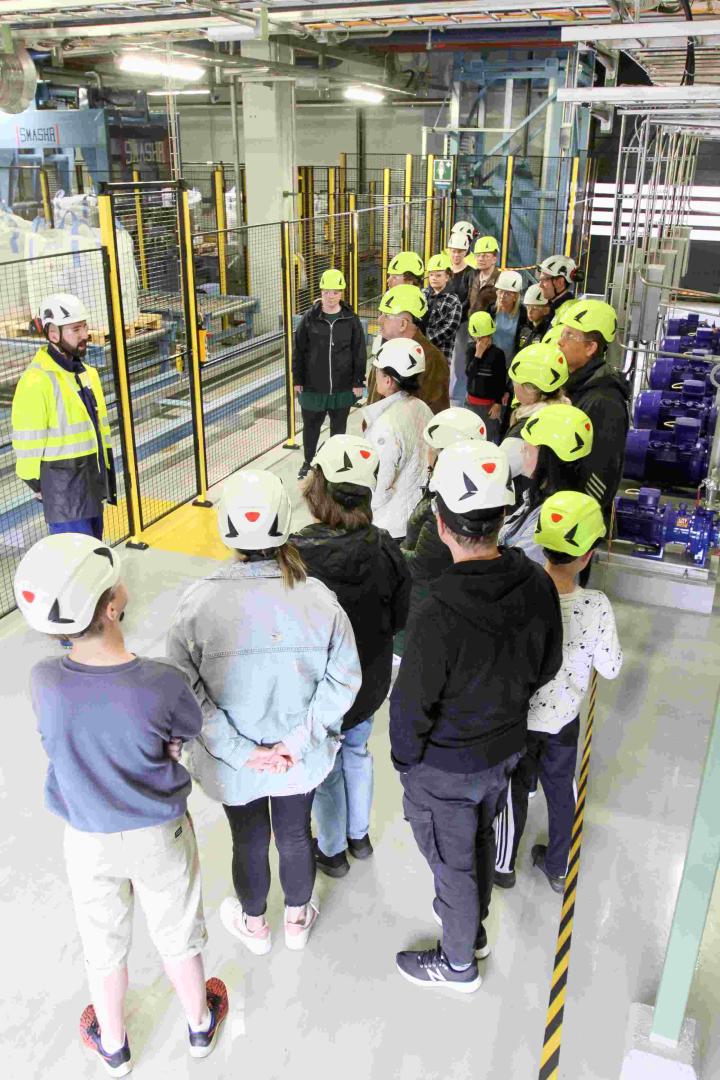 Kierroksen aikana vierailtiin myös uudella katodimateriaalien tuotantolinjalla, joka on tärkeä osa sähköajoneuvojen akkumateriaalituotannossa. Kuvassa prosessi-insinööri Niklas Jylhävuori kertoo tuotantolinjan eri vaiheista.